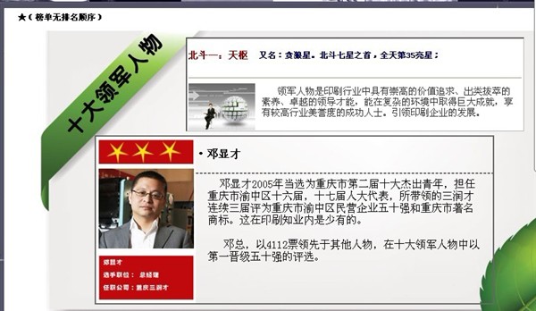 中國印刷行業的十大評選,一直是被譽為:“印刷行業中的奧斯卡”最高獎,來自中國西部唯一的參評企業,重慶三潤才印刷設備制造有限公司總經理,在初評五十強中,三十強中,十強中,一直高票領先。用實力證明重慶印刷包裝機械制造水平不斷提升,角逐國內市場,走向國際化。